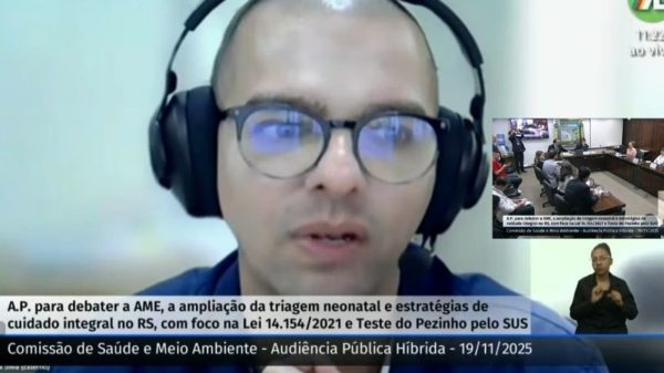 O encontro também avaliou a implantação da triagem neonatal e a implementação da Lei 14.154/2021, que amplia o Teste do Pezinho pelo SUS O conselheiro do Cremers, André Luiz da Silva, participou de audiência pública para debater sobre a Atrofia Muscular Espinhal (AME), com foco na triagem neonatal e nas estratégias de cuidado integral no...
