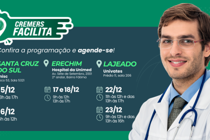Nos próximos dias, as equipes do Cremers estão em imersão no interior do estado levando serviços para os médicos em três cidades gaúchas. Santa Cruz do Sul foi o primeiro destino, onde o Facilita esteve nos dias 15 e 16 na Unisc. Já hoje e amanhã, 17 e 18, o município de Erechim recebe o Conselho, no Hospital da Unimed. Na semana seguinte, o Cremers vai a Lajeado, na Univates, nos dias 22 e 23.