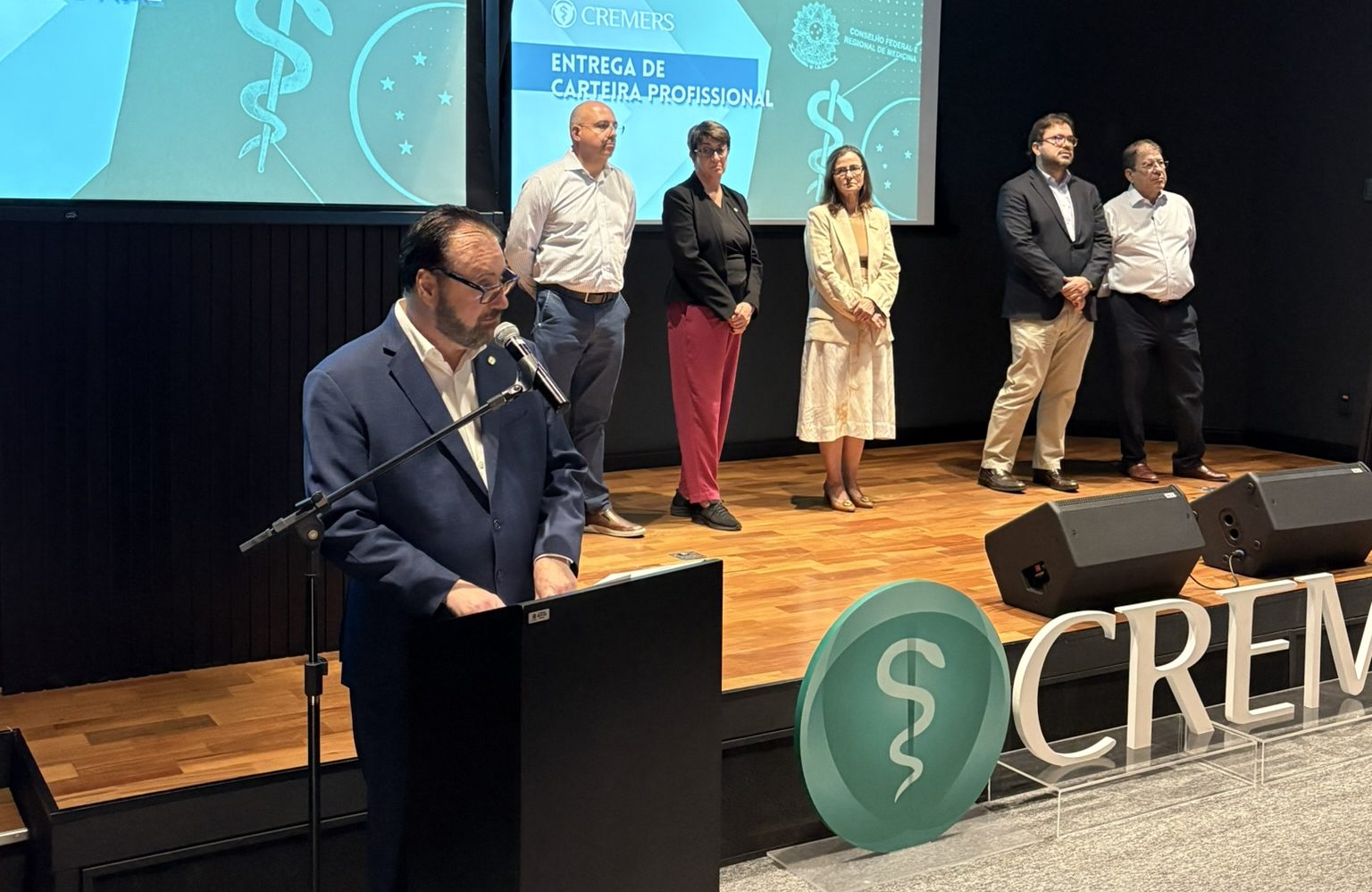 Em seu pronunciamento, o presidente Régis Angnes parabenizou os novos médicos pela conquista e reforçou que a prática da Medicina se sustenta não apenas no domínio técnico, mas também na empatia. “Vocês escolheram uma profissão que é, em sua essência, uma missão: a missão de cuidar de outras pessoas, de promover a saúde, combater a doença e, acima de tudo, melhorar a qualidade de vida de quem confia o cuidado e a vida em suas mãos”, afirmou. “Lembrem-se sempre que a base da nossa profissão não está apenas no conhecimento técnico, que é fundamental, mas na relação de confiança com o paciente.”